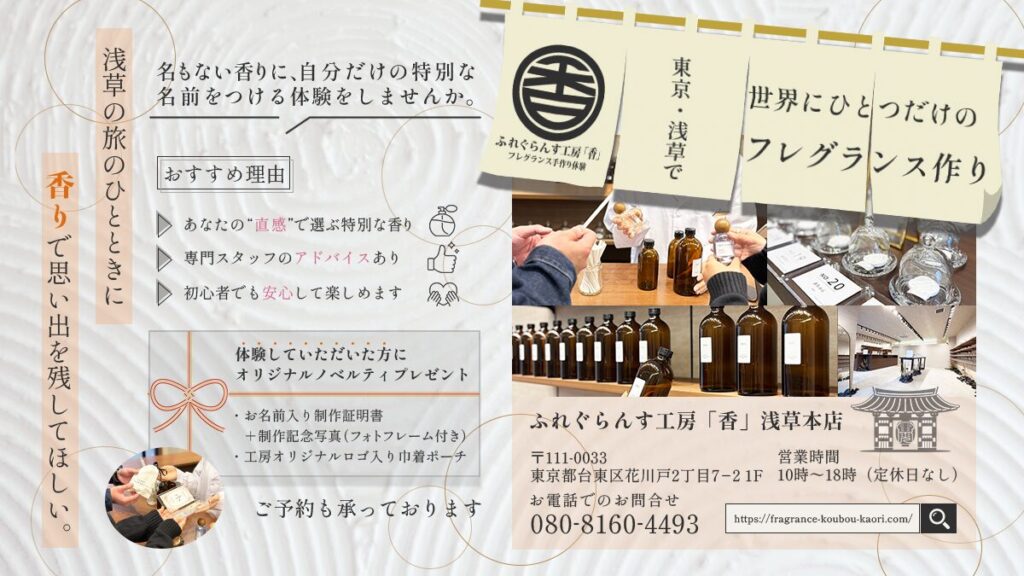 浅草・浅草寺から徒歩2分。 ふれぐらんす工房「香」‐ あなたの“好き”を形にする香りづくり体験、はじまりました 浅草寺・二天門の出口から徒歩2分、浅草駅から徒歩5分。馬道通りに面した1Fの路面店に、**自分だけのフレグランス(雑貨)**を作れる体験工房... -